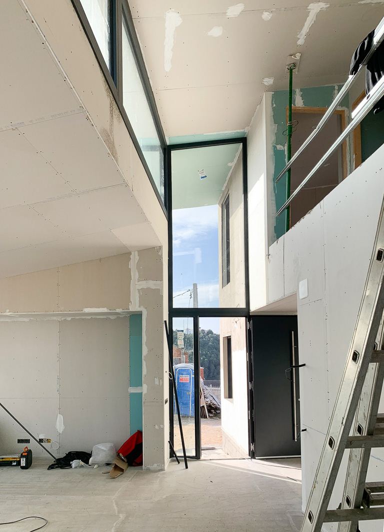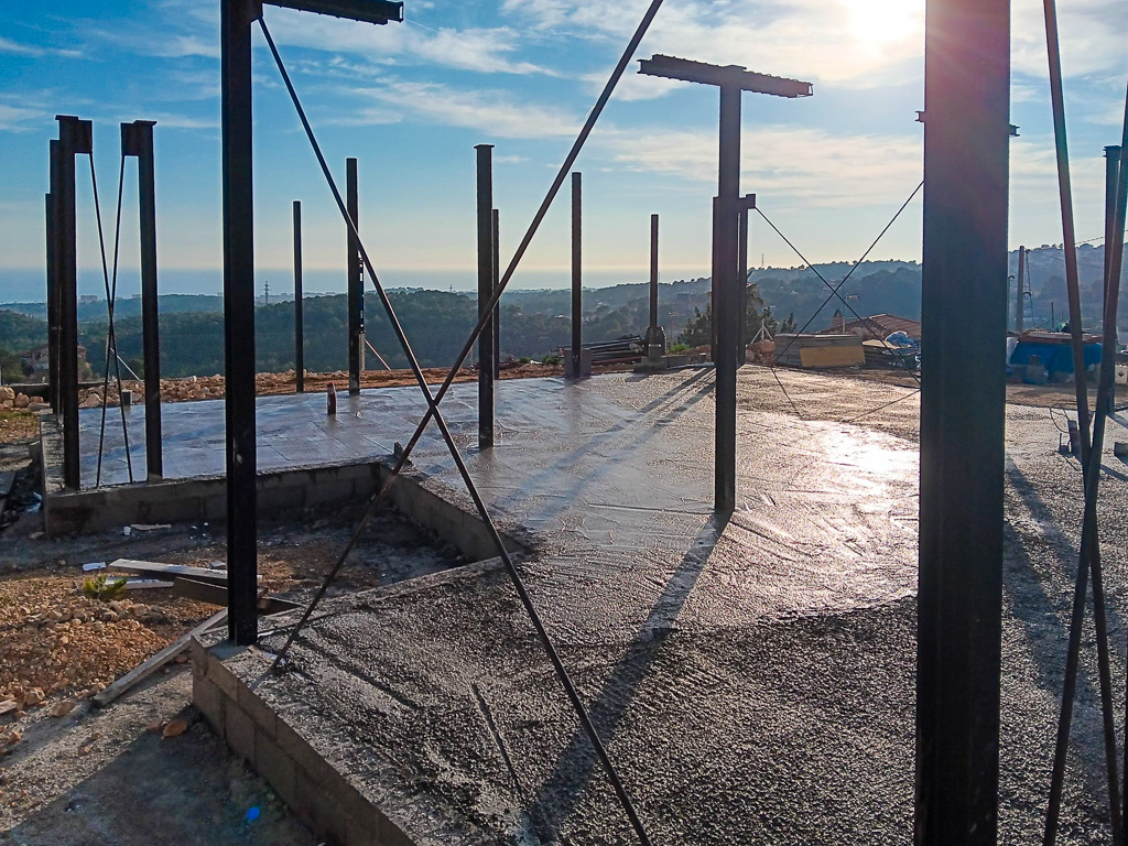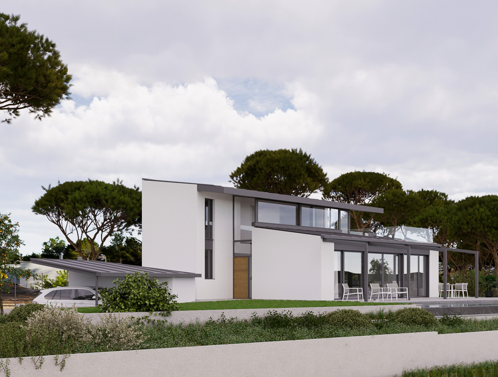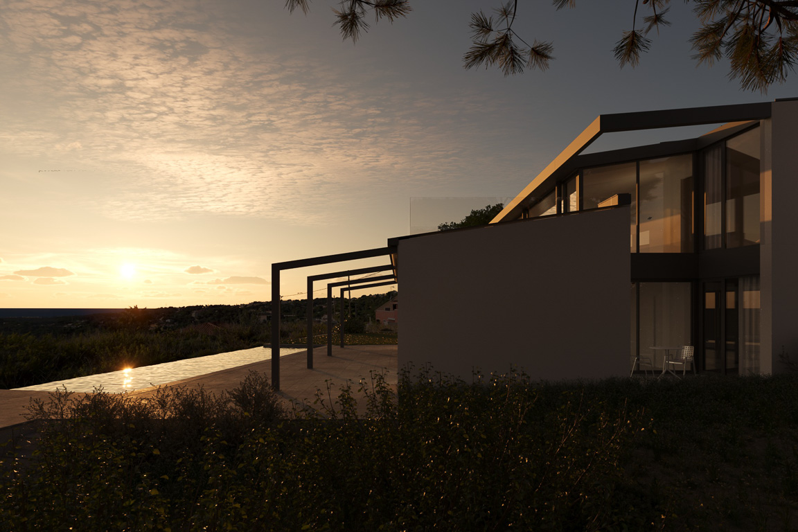 Casa unifamiliar amb piscina al cim d'un turó amb vistes al mar, per a un client que treballa principalment des de casa. Els espais es distribueixen en tres volums amb orientació diferenciada, per adaptar-se millor a la geometria del terreny. El volum nord es desenvolupa en dues plantes i allotja els dormitoris i l'estudi —peça de gran importància per al client— en una posició privilegiada amb vistes al mar. El volum sud, d'una sola planta, s'orienta al jardí i la piscina i conté la zona de dia. El volum central és un doble espai majoritàriament de vidre que articula la resta de volums.