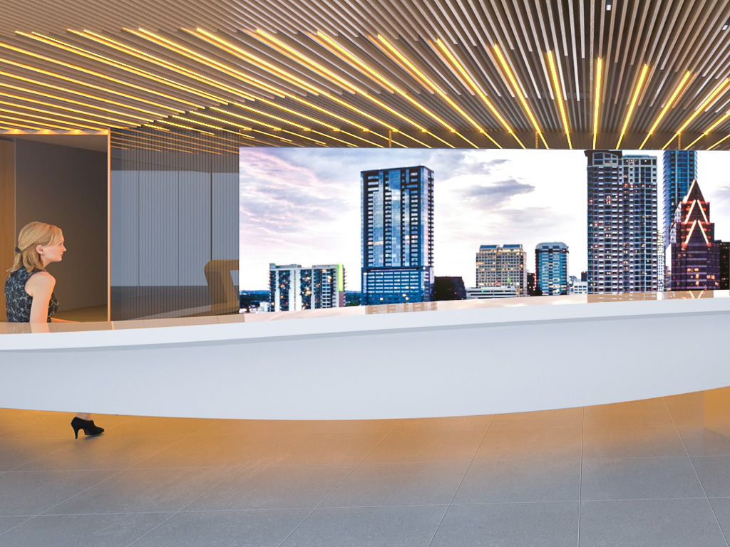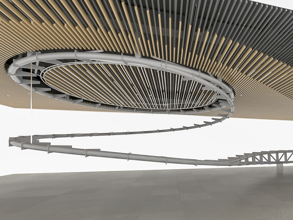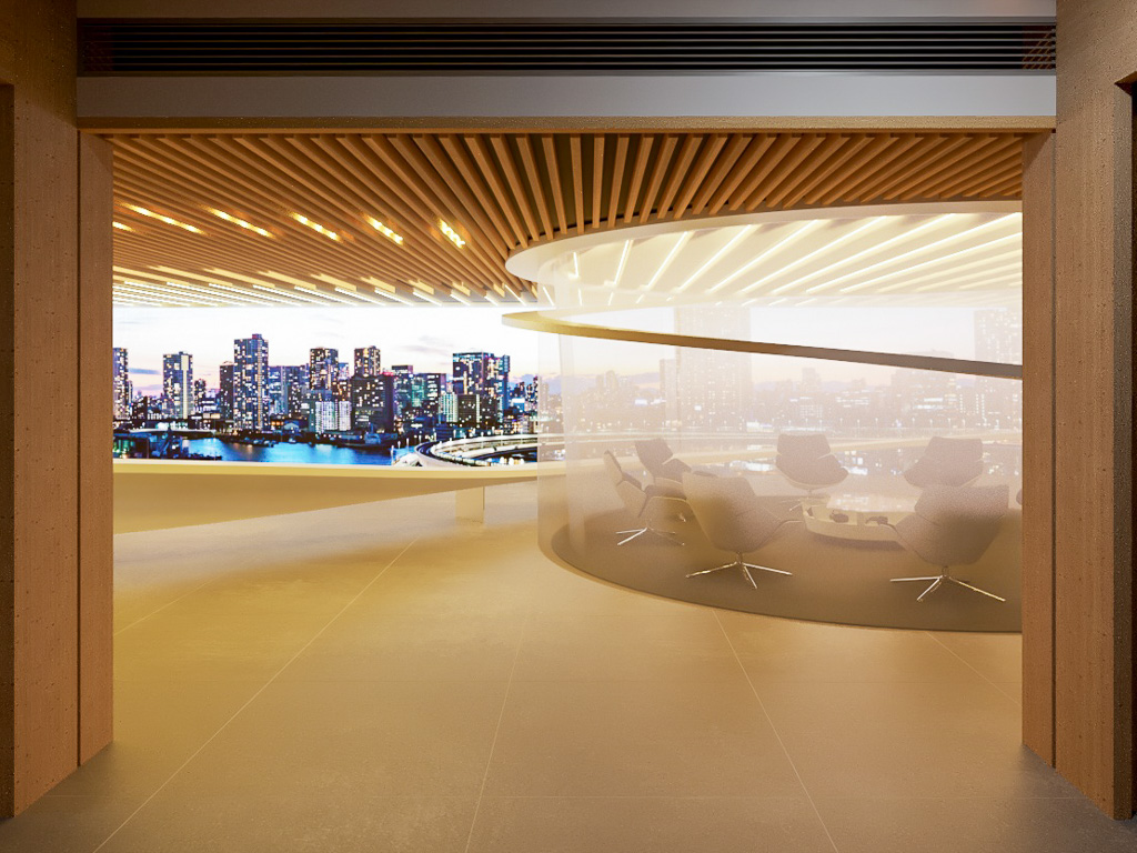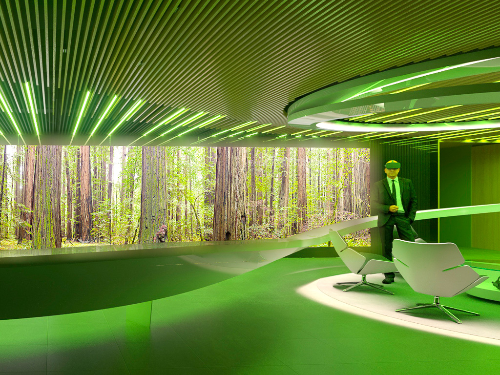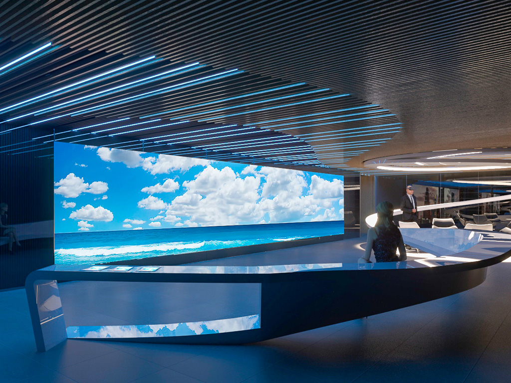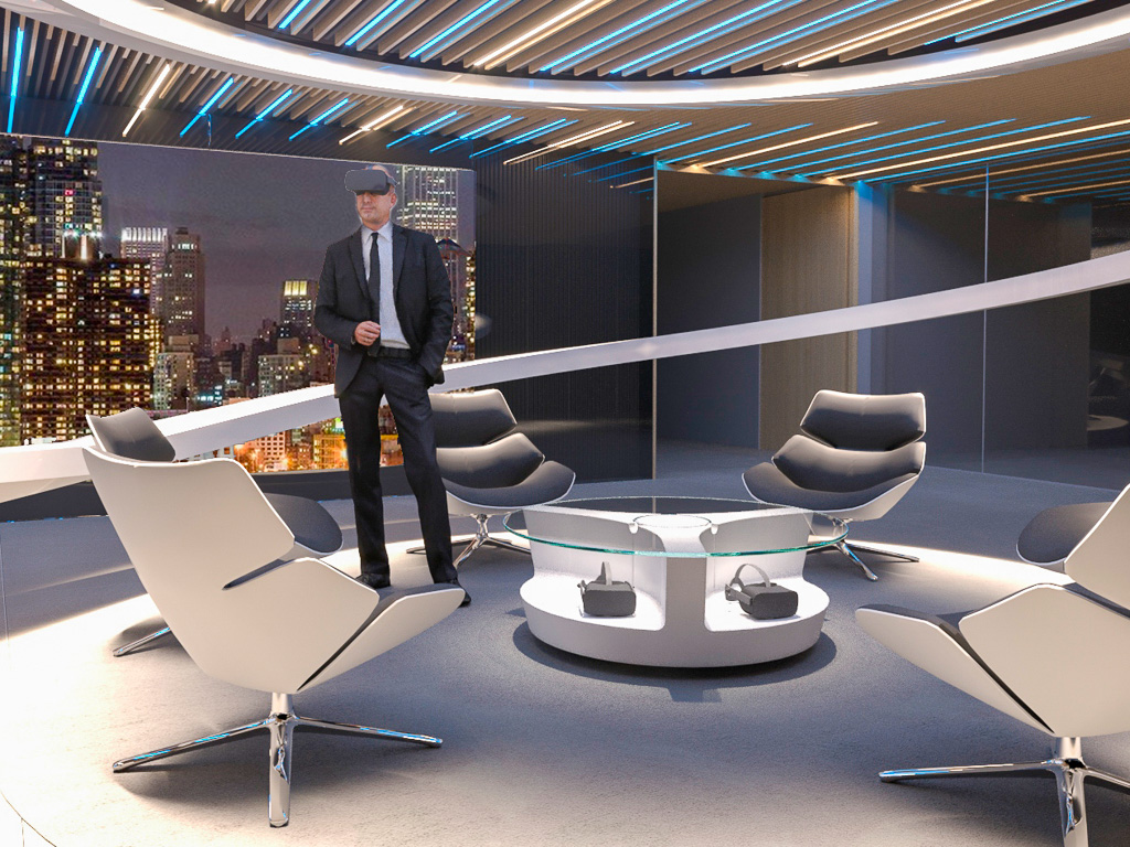 Diseño de un showroom en el vestíbulo de la sede de una empresa multinacional en Cataluña. El concepto consiste en presentar información corporativa a lo largo de un recorrido continuo, con las diferentes áreas de contenido conectadas por un elemento de mobiliario largo y curvo: una franja blanca que comienza siendo un banco y termina en la zona de realidad virtual. El proyecto se desarrolló en colaboración con una empresa especializada en productos audiovisuales.