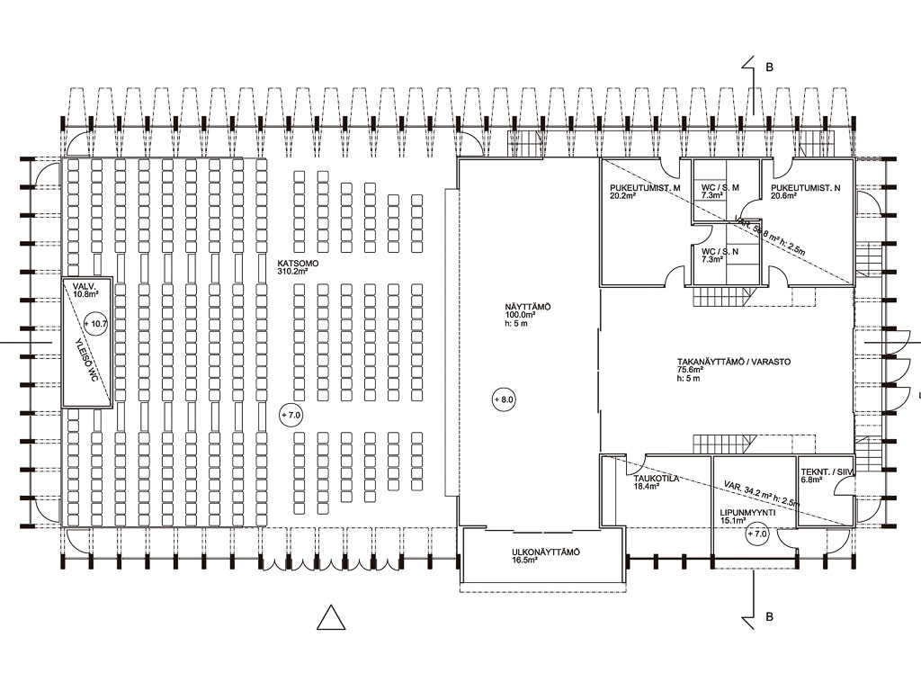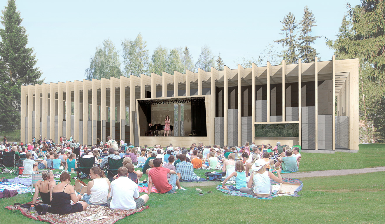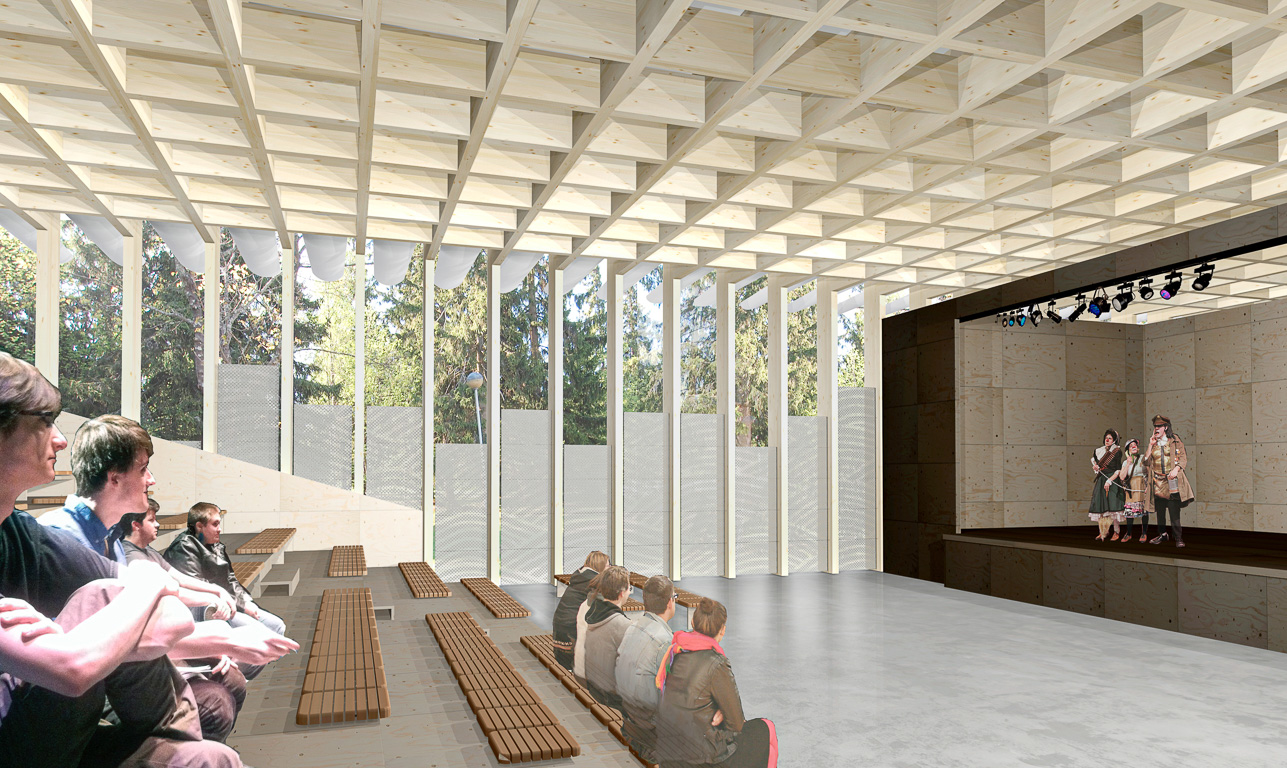 Concurso abierto organizado por el Ayuntamiento de Oulu para diseñar un pabellón cubierto para el Teatro de Verano de la ciudad. La propuesta consistió en un pabellón de estructura de madera con una forma de caja cuadrada claramente definida, en contraste deliberado con la naturaleza y el parque exterior. La solución incluía además un escenario secundario que podía abrirse al parque para acoger diferentes tipos de actividades. La propuesta fue premiada con una mención de honor y adquirida por la organización.