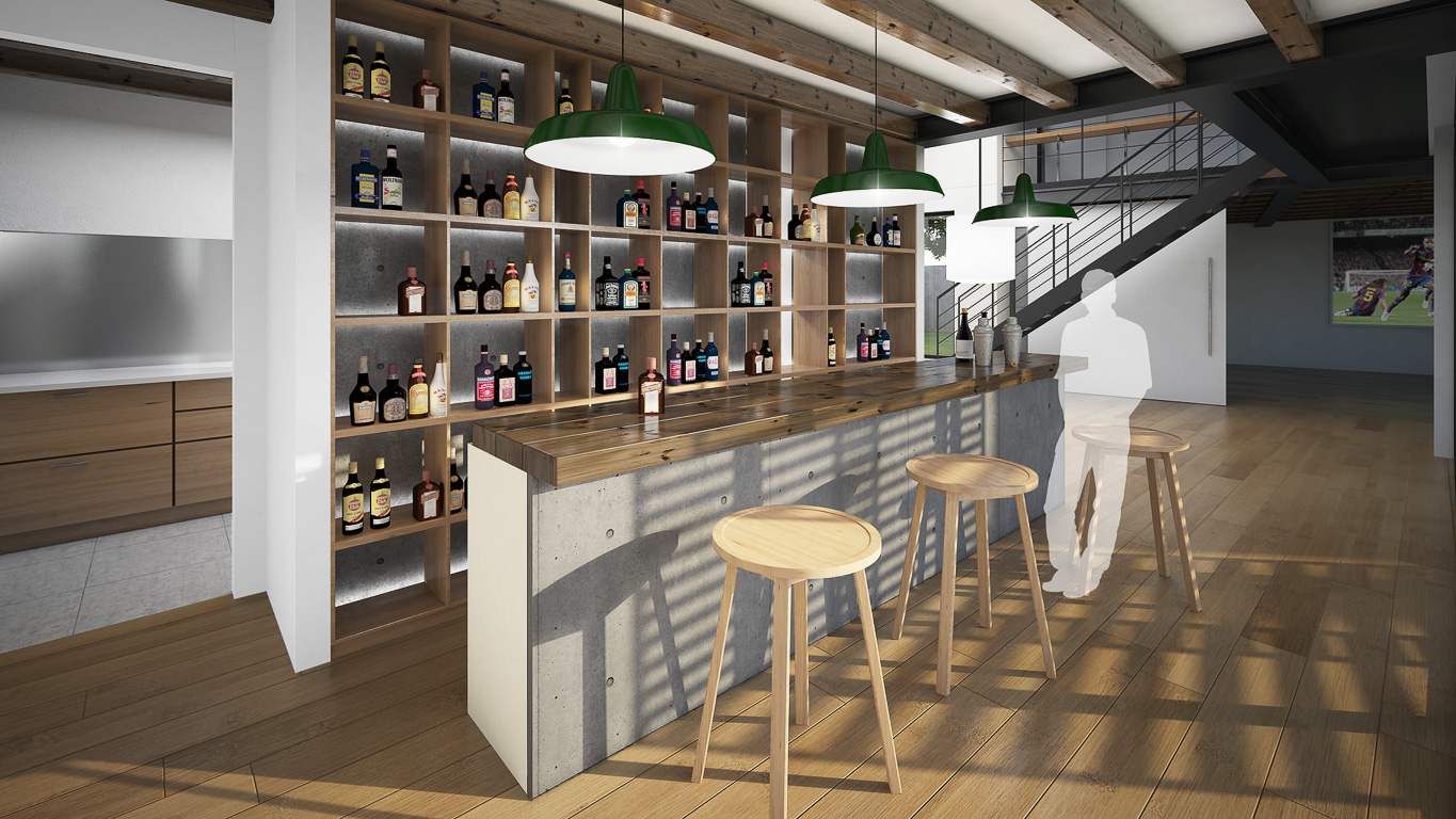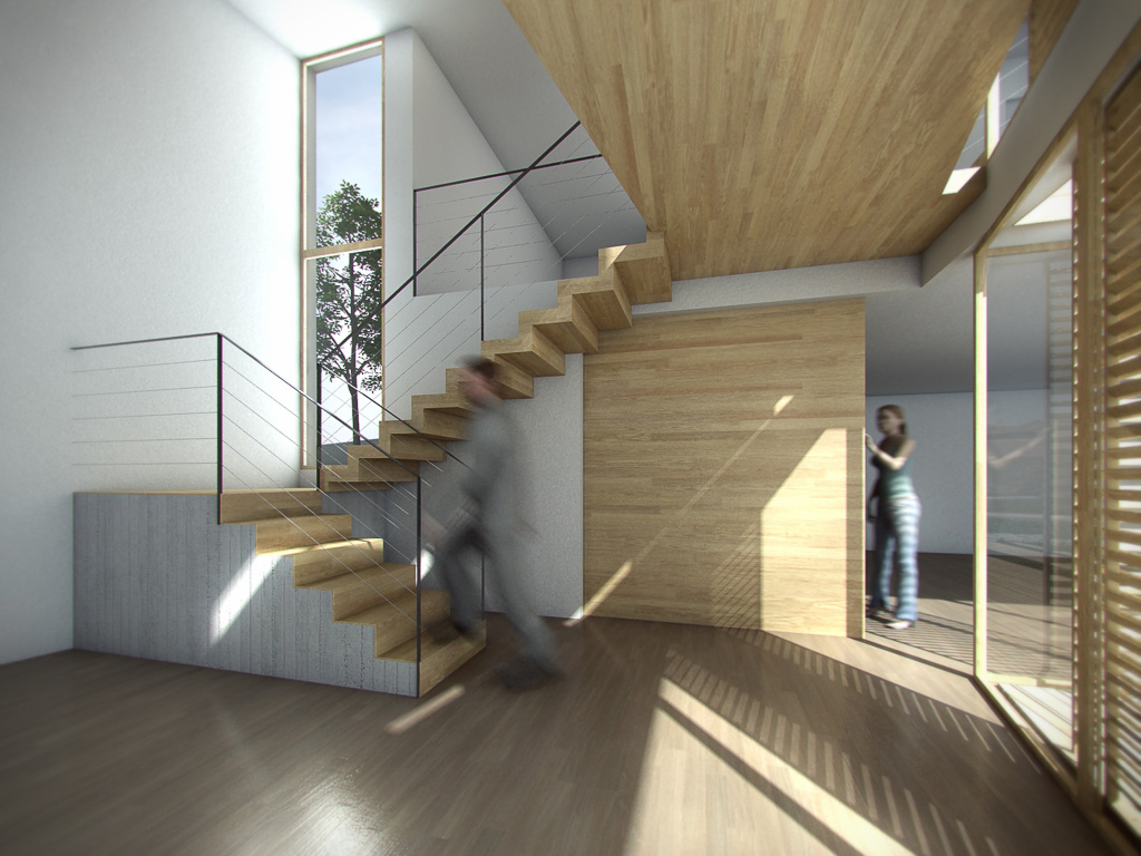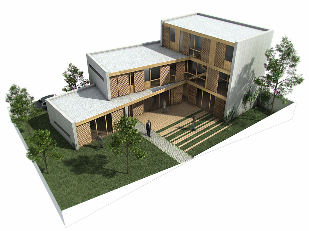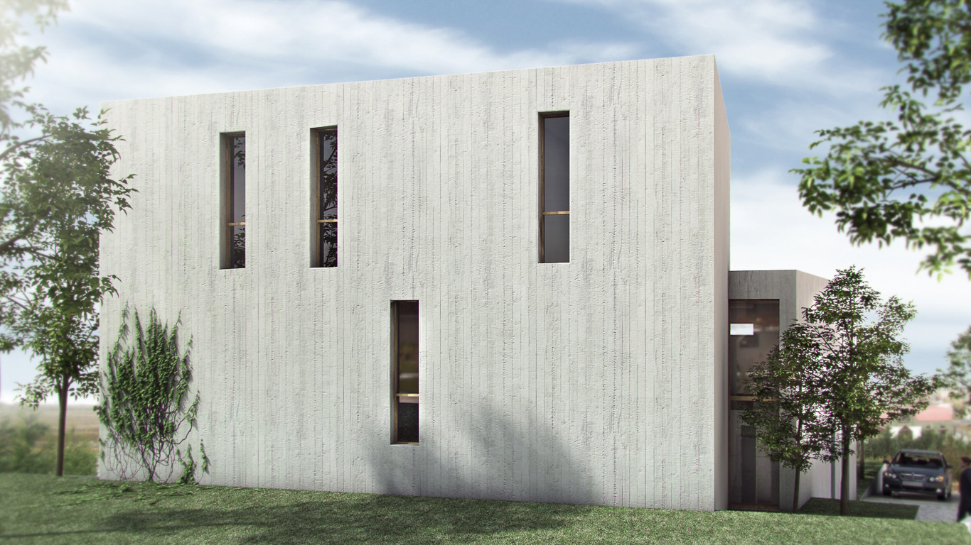 El proyecto se ubica en una parcela rectangular con ligera pendiente, situada fuera del casco urbano. La vivienda se organiza en forma de L, abierta al sur, liberando el máximo espacio para el jardín —por el cual se accede a la casa— y dejando una zona más compacta y funcional al norte para el acceso rodado. Las fachadas norte y laterales se resuelven con hormigón prefabricado, con pequeñas aperturas orientadas intencionadamente que controlan las vistas. Las fachadas orientadas al sur se abren con grandes superficies acristaladas hacia el jardín privado, protegidas de la radiación solar por grandes paneles de lamas correderas. Las cubiertas, planas y aterrazadas, se conciben como prolongación del espacio interior. La planta baja concentra todas las zonas de día, orientadas al jardín y articuladas en torno a una barra central que se convierte en el corazón de la vivienda, respondiendo así a las necesidades sociales de los clientes, vinculados al mundo de la restauración. Superficie: 303 m².