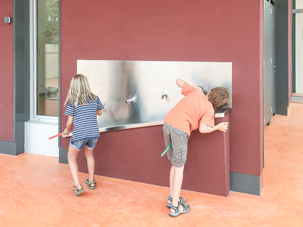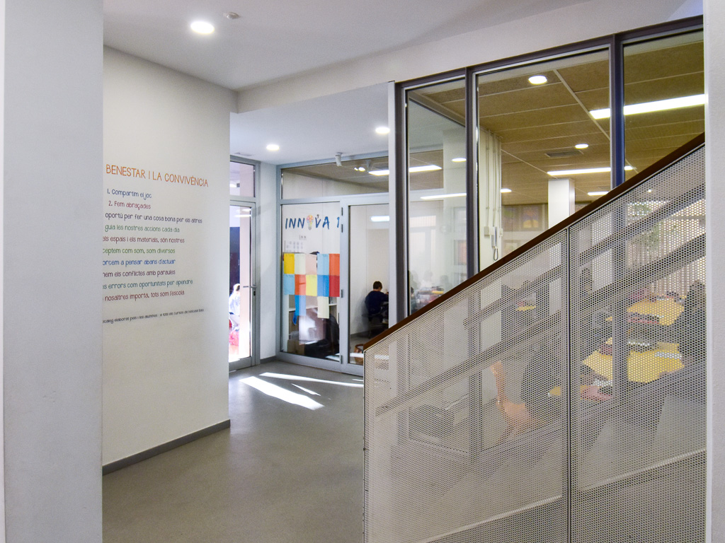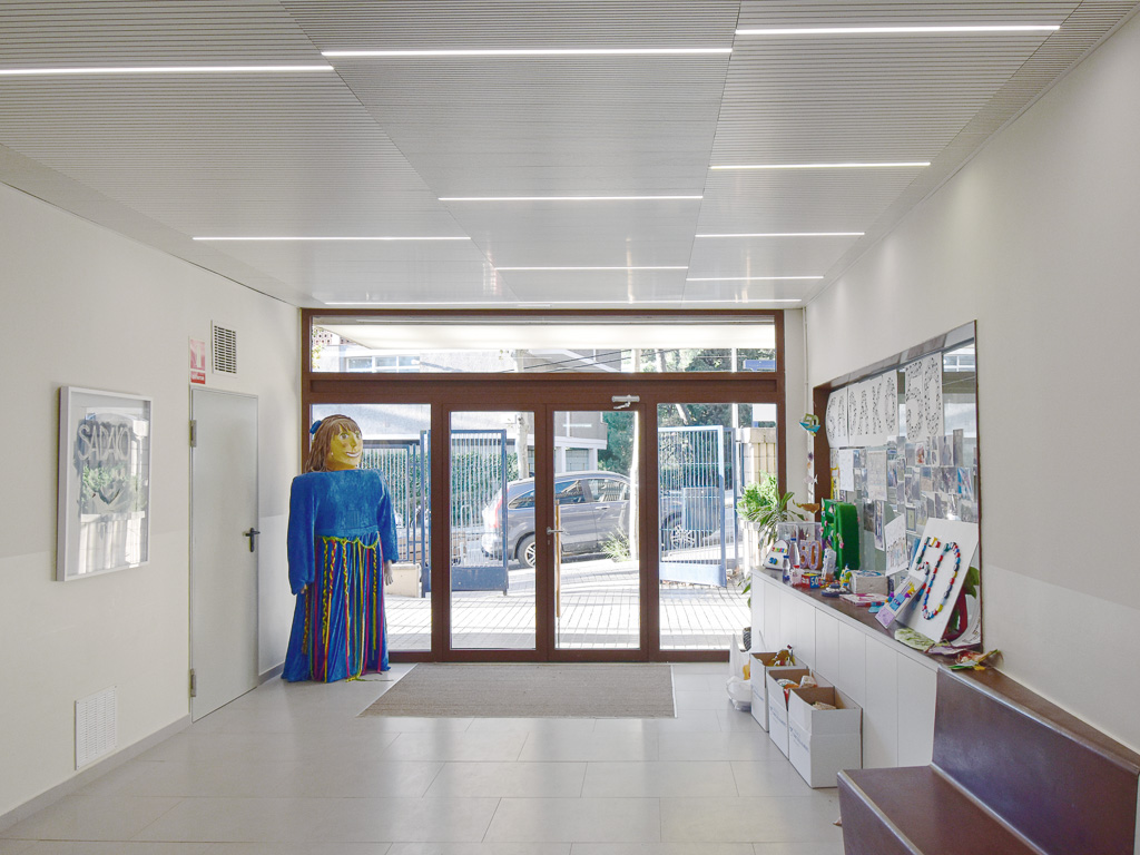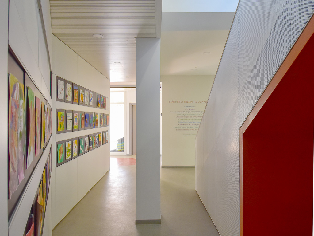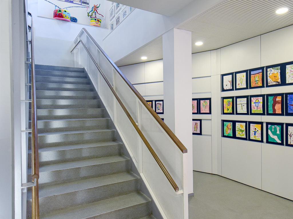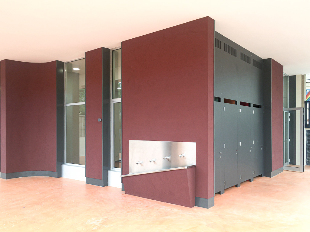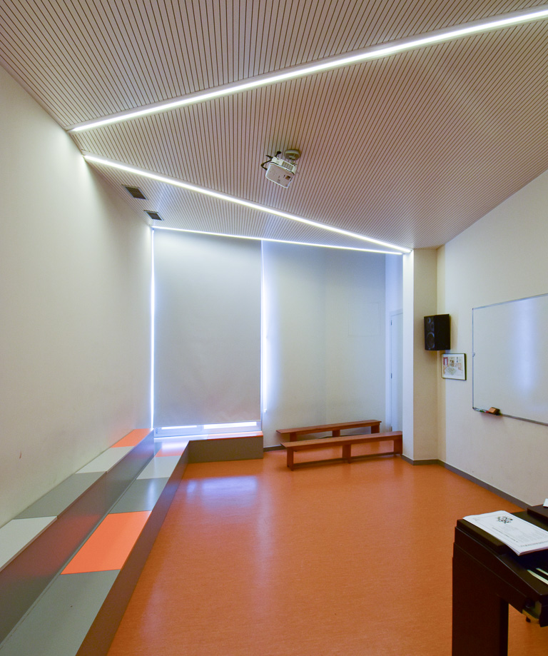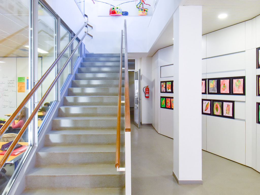 The project aimed to improve the school's semi-basement ground floor by creating a series of multipurpose spaces suitable for use as a dining room, auditorium or classroom. The renovation also needed to improve circulation and allow certain areas — primarily toilets and changing rooms — to remain accessible outside school hours and at weekends. The key move was to relocate a single stair flight, which alone allowed the floor to be reorganised and improved the connection to the exterior. All spaces were fully refurbished. The choice of colours, materials and finishes prioritised durability, robustness and ease of cleaning. Spatial flow and visual transparency between rooms were both enhanced.