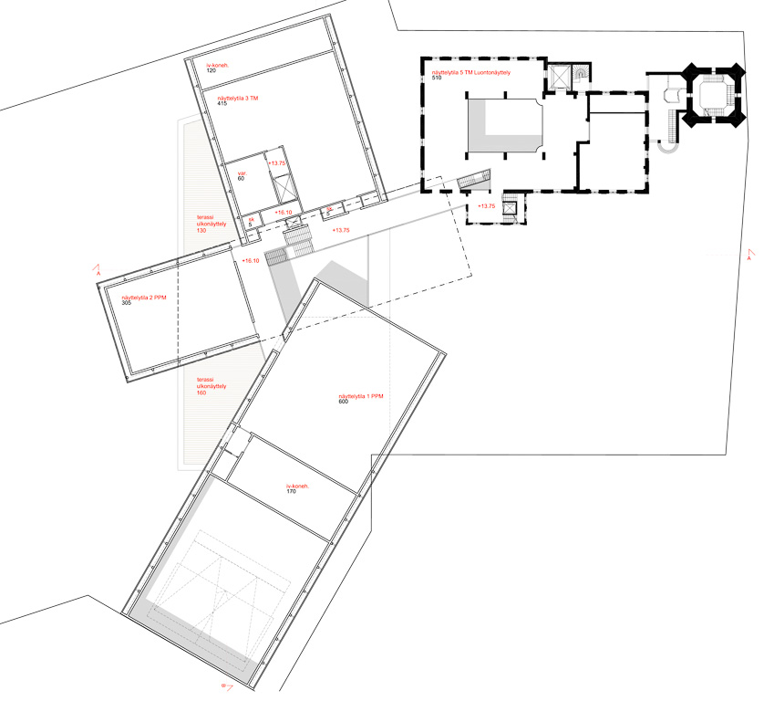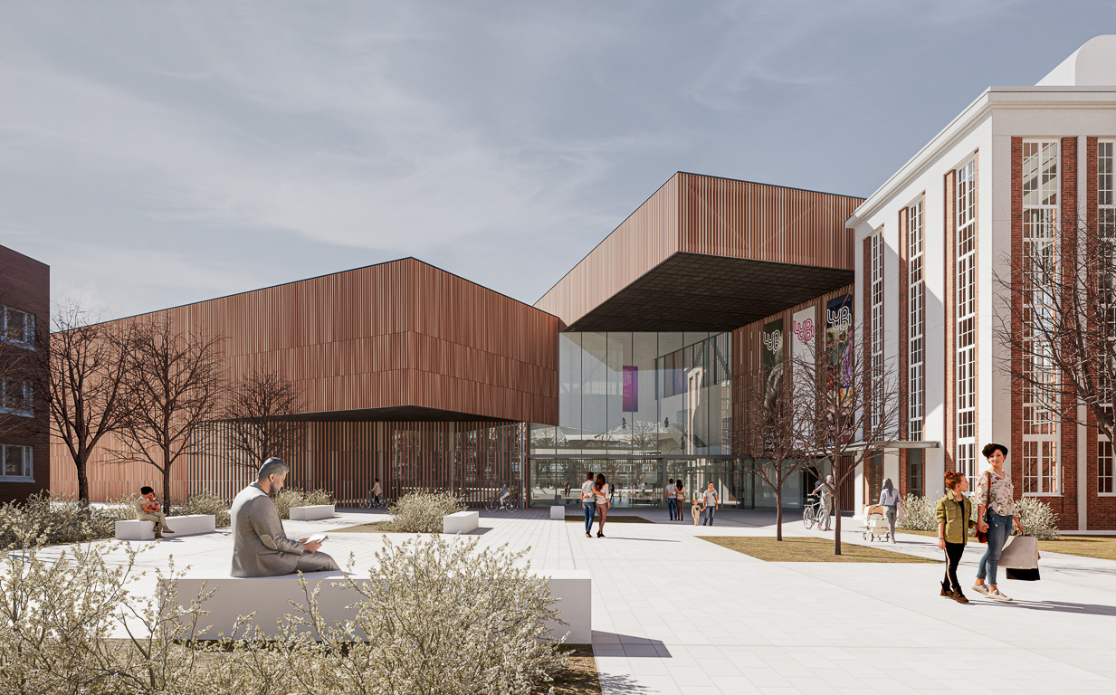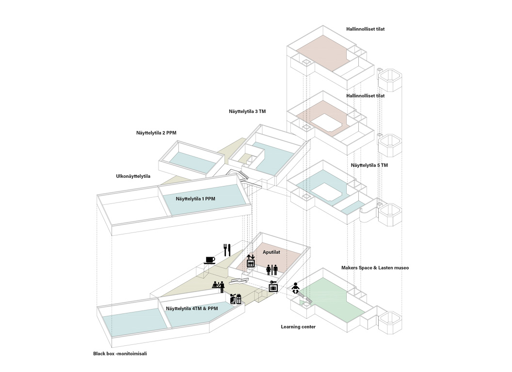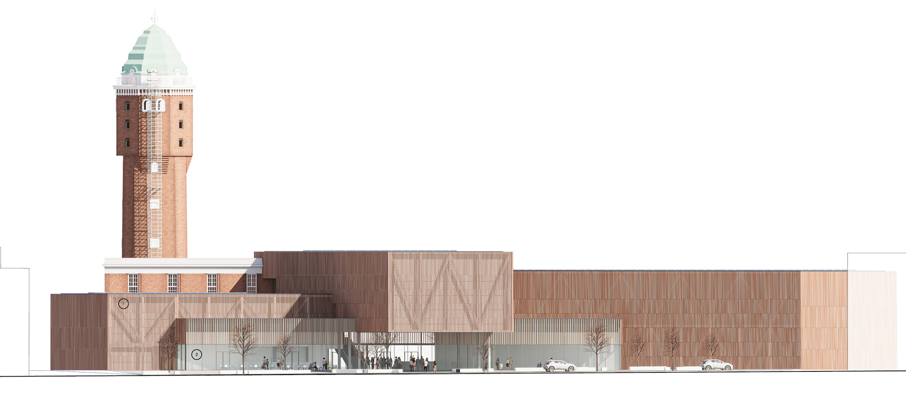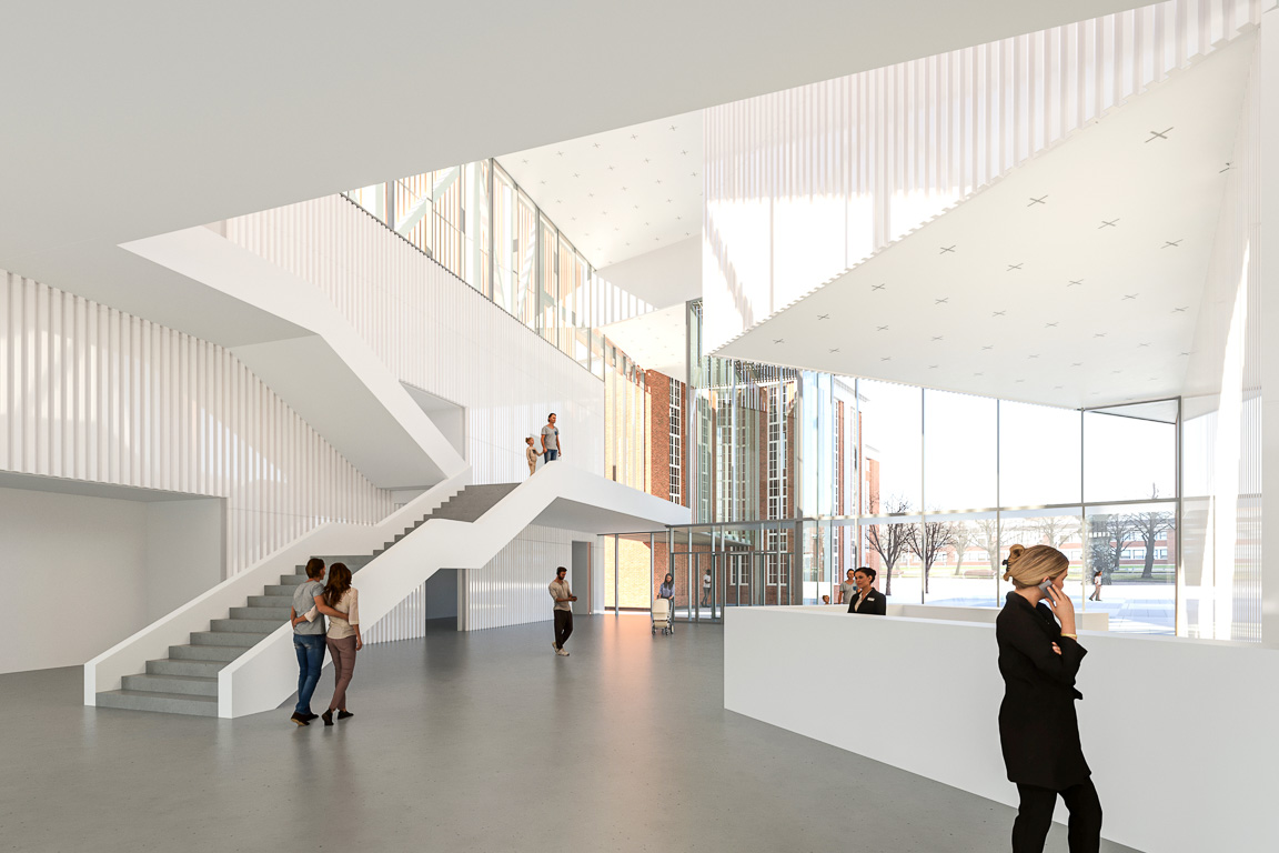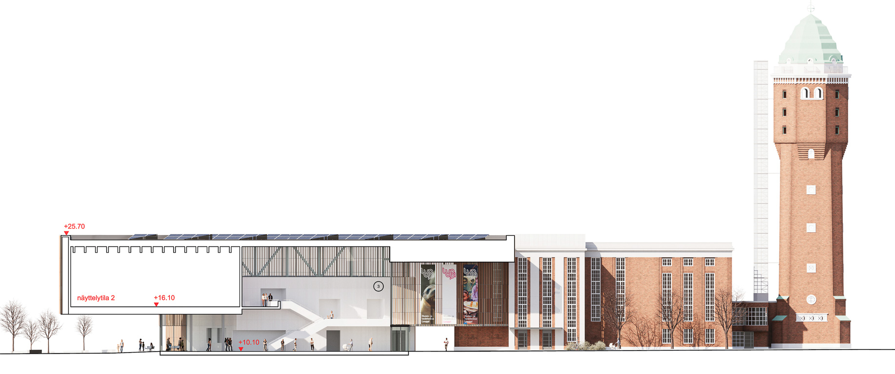 The proposal comprises three rectangular volumes that, together with the existing power plant building, form a varied and dynamic architectural ensemble. The historic water tower retains its role as an urban landmark within the old industrial landscape. The new volumes align with the axes of the existing masterplan, reinforcing the current urban layout and improving circulation routes. The museum complex is deliberately designed without a primary façade, making it welcoming and legible from all directions. The two-storey facades use a structural steel frame placed outside the exhibition spaces, giving precise control over acoustics and climate while allowing flexibility for varied installations. The double-skin facades also allow the building to glow like a lantern at night. The material palette draws on the brick of the surrounding factory buildings: the facades are clad with brick-red ceramic bars concealing either transparent or opaque glazing according to orientation. The entrance hall, by contrast, is lined with white-glazed ceramic bars, creating a deliberate transition from the industrial exterior to the light, neutral interior and the exhibition spaces beyond.